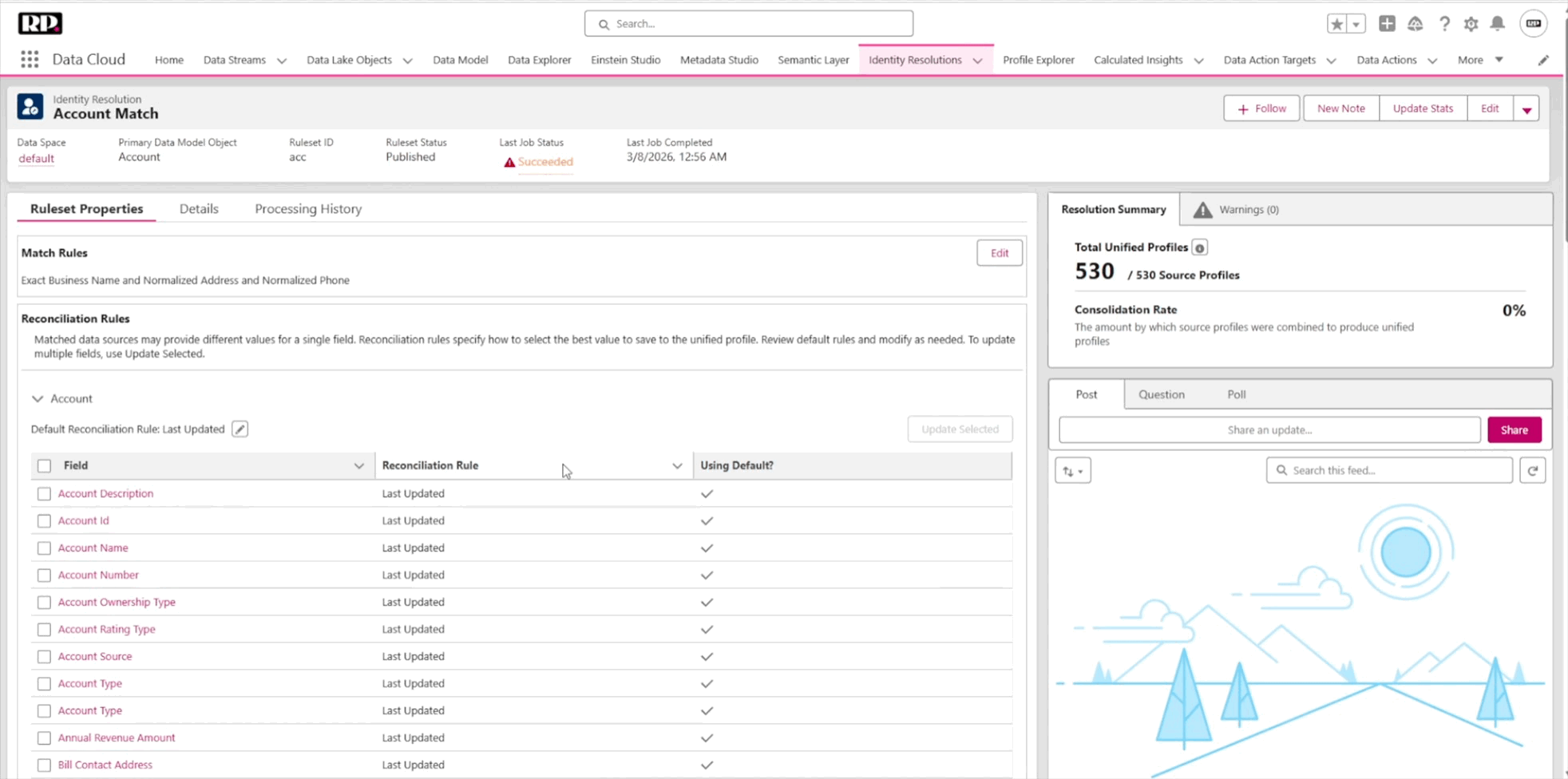 For example, the account description will use the value that was last updated. Most default reconciliation rules follow this same “last updated” pattern, but you can set specific ones for specific fields. This also extends to contact point address, contact point email, and contact point phone, all of which you can configure with different reconciliation rules to decide which field to pick from which object.